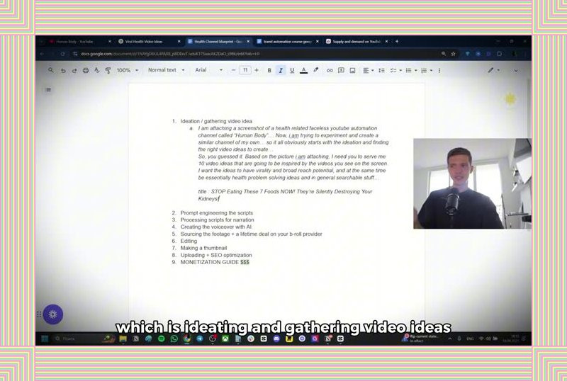 이제 본격적인 콘텐츠 제작 과정으로 들어가 보겠습니다. 가장 첫 단계는 바로 영상 아이디어 구상입니다. 경쟁 채널들을 분석하고, 성공적인 영상들의 스크린샷을 찍어두는 것부터 시작하세요. 그리고 Chat GPT와 같은 AI 도구를 활용하여 이 정보들을 기반으로 새로운 영상 아이디어를 무궁무진하게 생성할 수 있습니다. 예를 들어, "심장 문제의 경고 신호 10가지", "당신의 신장을 망가뜨리는 최악의 음식 5가지"와 같은 구체적인 아이디어들을 AI가 순식간에 제시해 줄 것입니다. 이렇게 얻은 아이디어들을 체계적으로 관리하고, 틈새 시장 분석과 데이터에 기반하여 어떤 아이템을 영상으로 만들지 결정하는 것이 성공적인 YouTube 자동화 채널 운영의 핵심입니다.