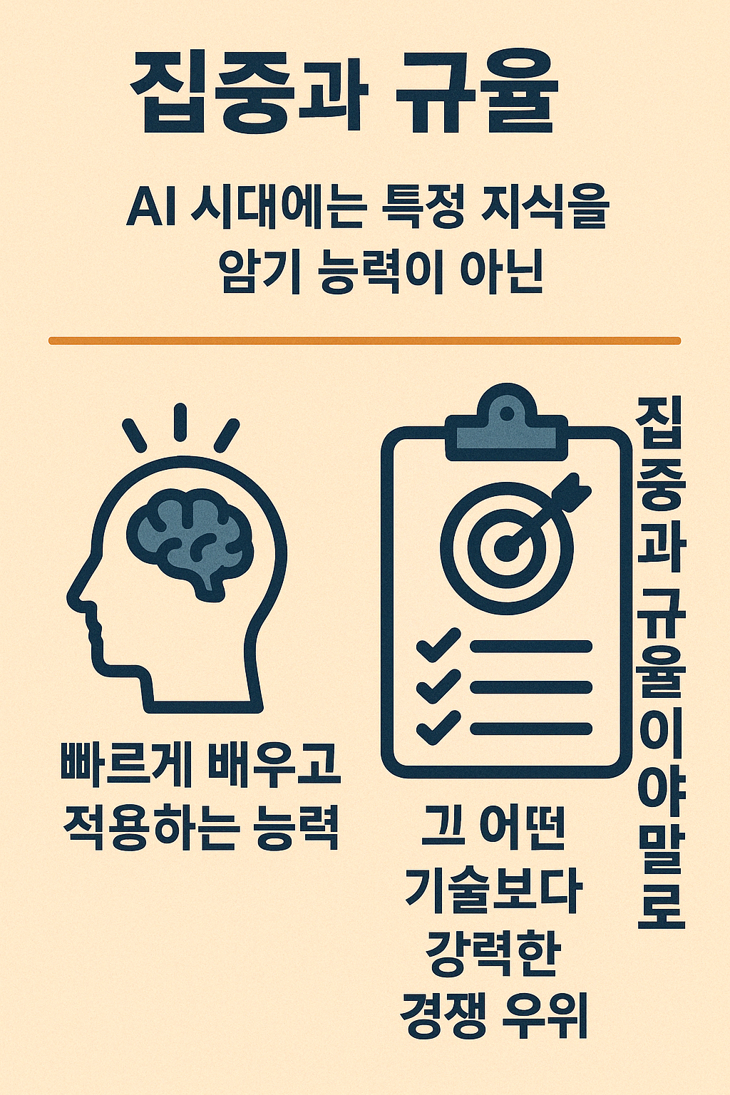바로 '집중과 규율'입니다. AI 시대에는 정보와 지식 자체가 예전만큼 큰 가치를 갖기 어렵습니다. AI가 방대한 정보를 순식간에 처리하고 요약해주기 때문이죠. 이제 중요한 것은 특정 지식을 암기하는 능력이 아니라, 새로운 것을 빠르게 배우고 적용하는 능력, 즉 '유동적 지능'입니다. 그런데 여기서 역설이 발생합니다. 우리 주변에는 AI를 활용한 수많은 도구와 정보가 넘쳐나고, 이는 우리의 주의를 끊임없이 분산시킵니다. 해야 할 일은 많고 유혹은 넘쳐나는 환경 속에서, 진정으로 중요한 일에 몰입하고 꾸준히 실행하는 능력, 즉 집중과 규율이야말로 그 어떤 기술보다 강력한 경쟁 우위가 됩니다. AI 도구를 잘 활용하는 것도 중요하지만, 그 도구들에 휘둘리지 않고 목표를 향해 나아가는 집중력, 이것이 바로 두 번째 핵심입니다. 기술이 아닌, 인간의 집중력이 궁극적인 해자가 되는 시대, 다음 트렌드는 우리의 역할에 대해 다시 생각하게 만듭니다.